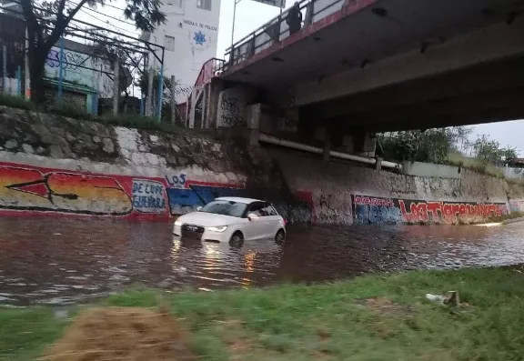 Oaxaca, Oax.- La fuerte lluvia que sacudió la noche del domingo en la Ciudad de Oaxaca, provocó inundaciones bajo el Puente Valerio Trujano, lo que ha generado el cierre de un carril.