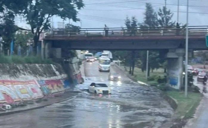Este lunes, el carril que vienen de la Central de Abastos con dirección al Tecnológico, se encuentra completamente inundado, lo que ha generado la retención de algunas unidades.