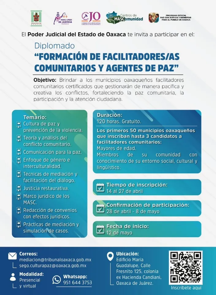 Mientras las autoridades municipales proporcionarán las sedes para instalar los Centros MASComunidad, el Poder Judicial se encargará de la capacitación, el seguimiento y la profesionalización continua, con apoyo de la Dirección de Cultura de Paz de la Secretaría de Gobierno, para consolidar una estrategia conjunta orientada a fortalecer la mediación comunitaria y la cultura de paz. ¿Cuándo se brindará la capacitación? La convocatoria para el Diplomado estará abierta hasta el 27 de abril. Los seleccionados serán responsables de operar los Centros MASComunidad y la capacitación iniciará el 12 de mayo y contará con un cupo limitado a 50 municipios en esta primera etapa. Reconstruir tejidos, el objetivo La estrategia busca despresurizar los sistemas judiciales, prevenir la violencia y reconstruir el tejido social desde lo local. Oaxaca es una entidad donde la pluralidad cultural exige respuestas diferenciadas y la mediación comunitaria se perfila como una herramienta clave. Fuente: https://www.milenio.com/estados/recurriran-mediacion-frenar-conflictos-comunitarios-oaxaca |